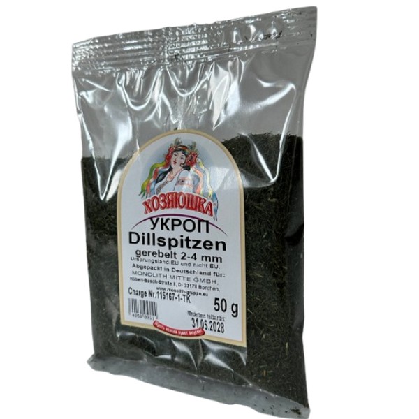 Verfügbar: 24 Stk.Dillspitzen 50 g. Ursprungsland: EU und Nicht-EU. Abgepackt in Deutschland