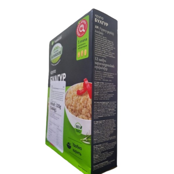 Verfügbar: 10 Stk.Aromatisches Weizenkorn mit leicht nussigem Geschmack. Zutaten: Bulgur (Hartweizen). Bleibt beim Kochen locker und körnig. Ideal als Beilage, für Salate und warme Gerichte. Durchschnittliche Nährwerte pro 100 g: Brennwert — 1457 kJ / 343 kcal Fett — 1,1 g, davon gesättigte Fettsäuren — 0,5 g Kohlenhydrate — 69,1 g, davon Zucker — 2,0 g Eiweiß — 14,2 g Salz — 0 g Hersteller: AO „Altaiskaja Krupa“, Russland Lagerbedingungen: Kühl, trocken und gut belüftet bei einer Temperatur bis +20 °C und einer Luftfeuchtigkeit von höchstens 70 % lagern. Nicht zusammen mit stark riechenden Produkten aufbewahren.