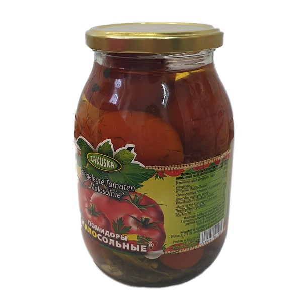 Verfügbar: 14 Stk.Zutaten: Tomaten, Zucker, Salz, Säuerungsmittel: Citronensäure, Peperoni, Knoblauch, Kirschblatt, Weintraubenblatt, Lorbeerblatt, Dill, Pfeffer, Kaliumiodat. Hergestellt in Mazedinien. Durchschnittliche Nährwerte je 100 ml: Brennwert: 138 kJ / 33 kcal Fett: 0,5 g (davon gesättigte Fettsäuren: 0,1 g) Kohlenhydrate: 6,9 g (davon Zucker: 5,1 g) Eiweiß: 0,8 g Salz: 1,4 g